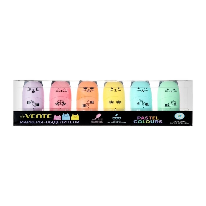 Набор маркеров-выделителей deVENTE. Kitty (6 цветов - пастельные цвета: роз, желт, зелен, фиол, оранж, гол) плоский мини-корпус, скошенный наконечник, ширина линии 1-5 мм, на специальном поддоне в пластиковой упаковке.