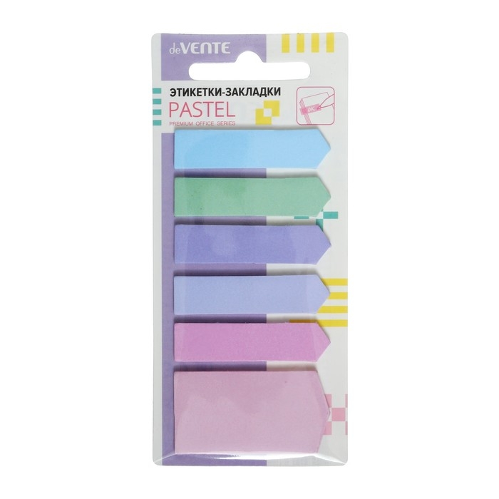 Набор самоклеящихся этикеток-закладок deVENTE. Pastel бумажные 44 x 11 мм и 44 x 24 мм, 20 листов, офсет 80 г/м2, печать 4+0, ассорти форм, 6 цветов, в картонном блистере и пластиковом пакете с европодвесом.