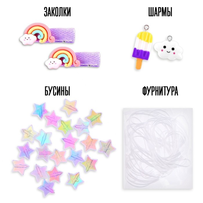 В комплекте: основа-резинка для браслета, заколки для волос, бусины, 2 шармика.