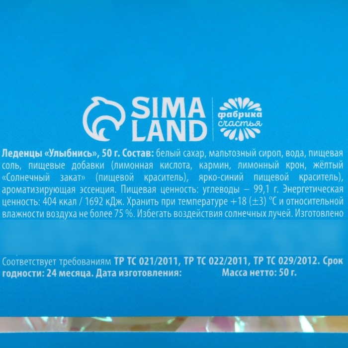 Состав: белый сахар, мальтозный сироп, вода, пищевая соль, пищевые добавки (лимонная кислота, кармин, лимонный крон, жёлтый "Солнечный закат" (пищевой краситель), ярко-синий пищевой краситель), ароматизирующая эссенция.