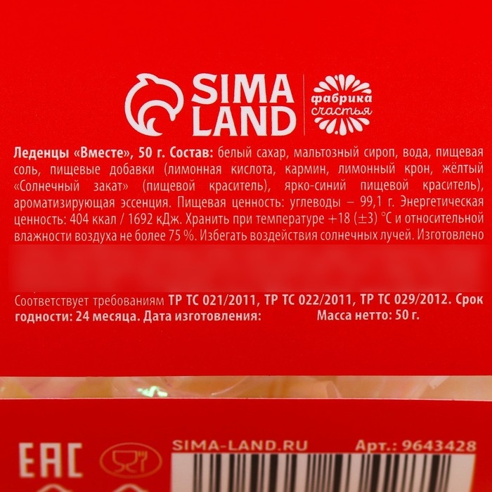 Состав: белый сахар, мальтозный сироп, вода, пищевая соль, пищевые добавки (лимонная кислота, кармин, лимонный крон, жёлтый "Солнечный закат" (пищевой краситель), ярко-синий пищевой краситель), ароматизирующая эссенция.