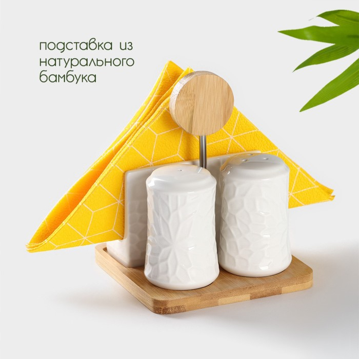 Набор фарфоровый для специй на бамбуковой подставке BellaTenero «Листья», 4 предмета: солонка 120 мл, перечница 120 мл, салфетница, подставка, цвет белый