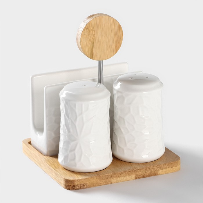 Набор фарфоровый для специй BellaTenero, 4 предмета: солонка, перечница, салфетница, подставка-держатель, цвет белый