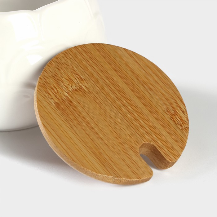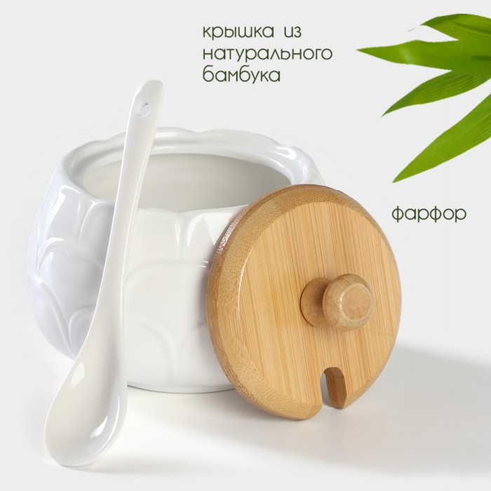 Сахарница фарфоровая с ложкой на бамбуковой подставке BellaTenero, 140 мл, цвет белый