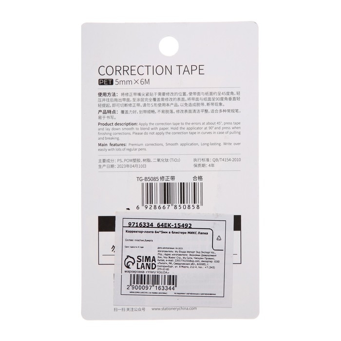 Корректор-лента 6м х 5мм "Лапка", в блистере, МИКС