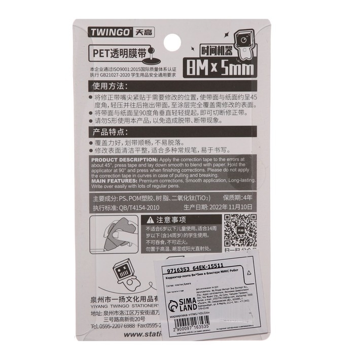 Корректор-лента 8м х 5мм "Робот", в блистере, МИКС