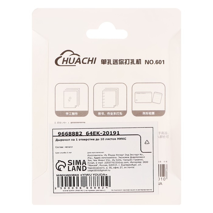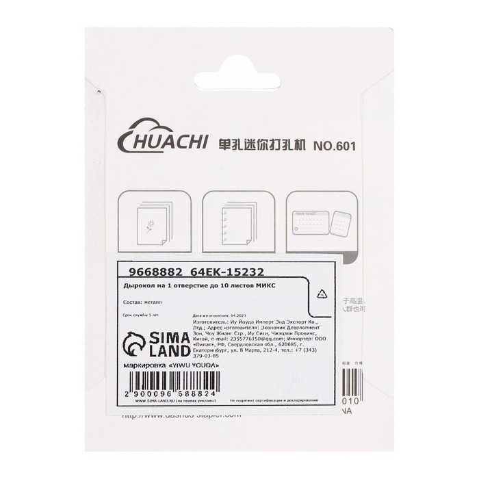 Дырокол на 1 отверстие, до 10 листов, металлический, МИКС