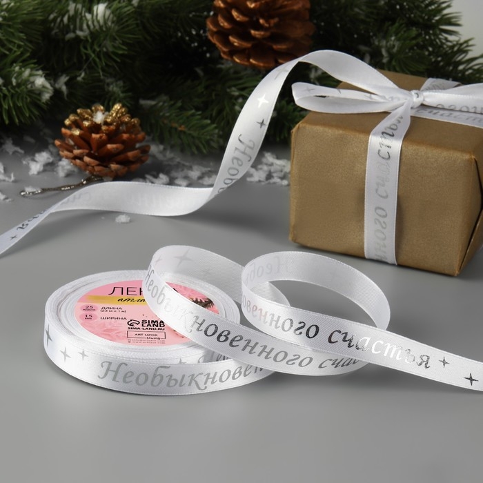 Новый год! Лента атласная с тиснением «Необыкновенного счастья», 15 мм, 23 ± 1 м, цвет белый/серебряный №001