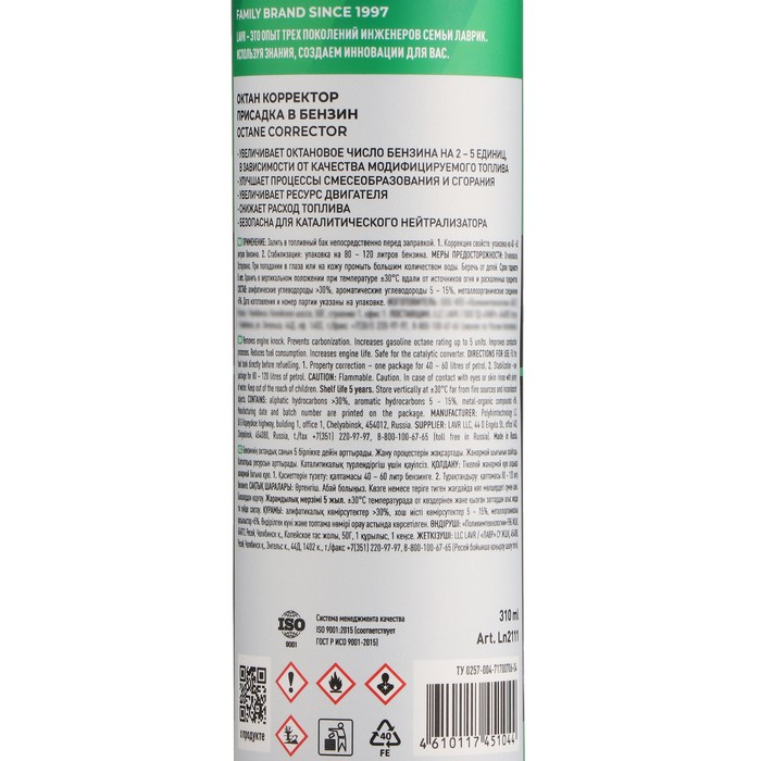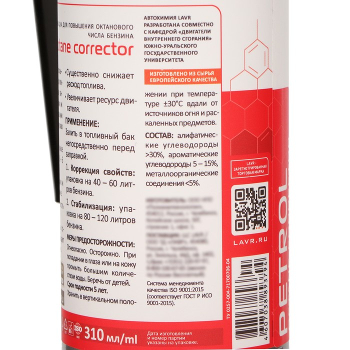Присадка в бензин LAVR октан Плюс, на 40-60 л, 310 мл Ln2111