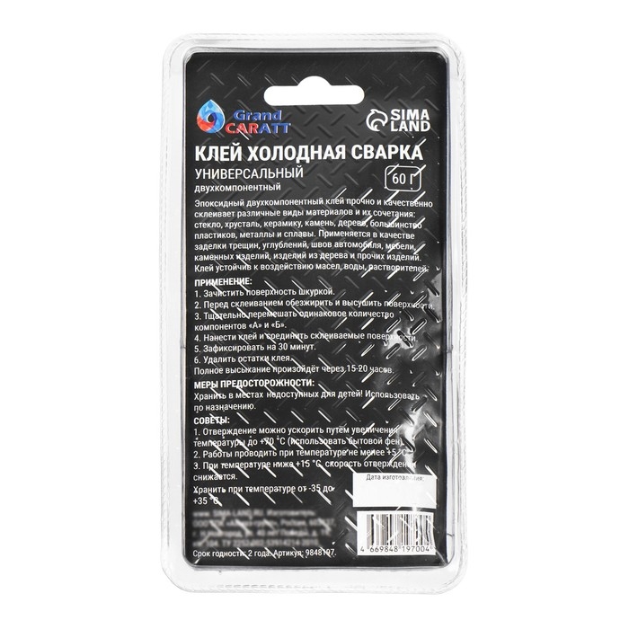 Эпоксидный клей К2 Grand Caratt прочно и герметично склеивает чёрные и цветные металлы, стекло, керамику, мрамор, камень, бетон, дерево, ткань, пластмассы (за исключением полиэтилена и полипропилена). Ликвидирует течи жидкостей в трубах, резервуарах, радиаторах, бензобаках и других емкостях. Обеспечивает ремонт в труднодоступных местах и в случаях, когда разработка не возможна.