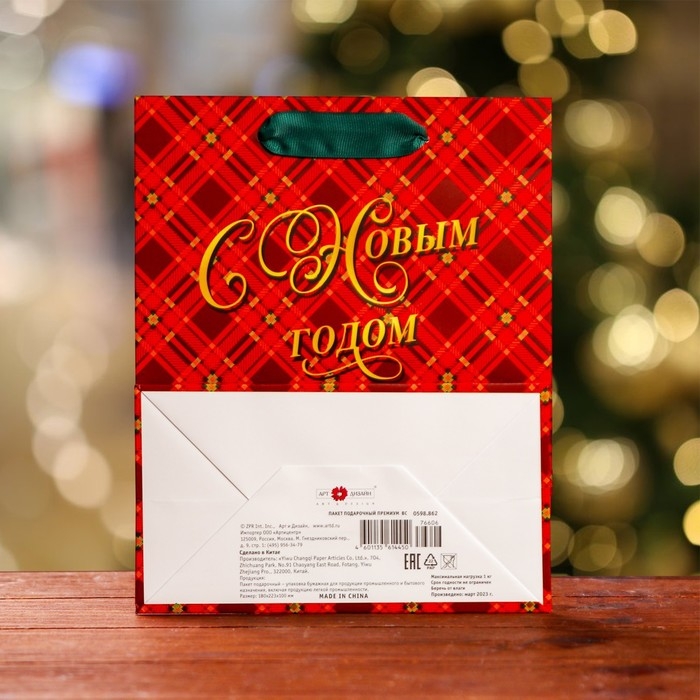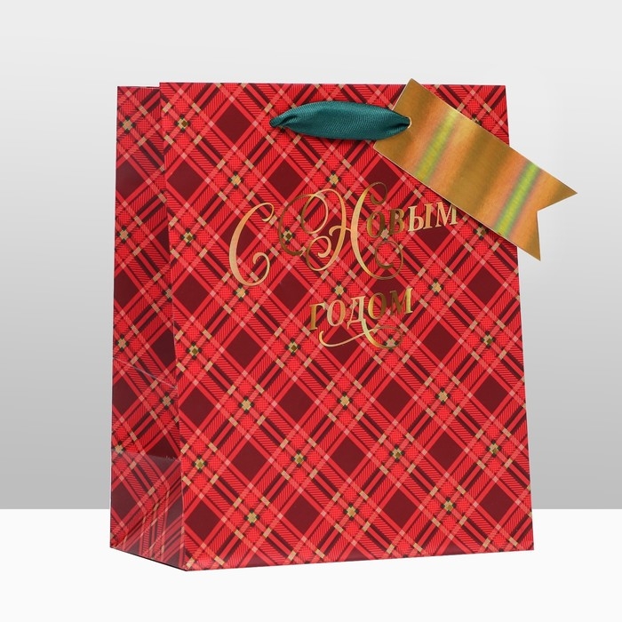 Новый год. Пакет подарочный "С Новым годом ", клетка, люкс 18 х 22,3 х 10 см.
