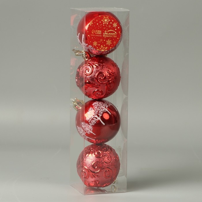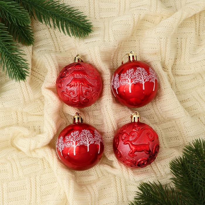 Набор шаров пластик d-5,5 см, 4 шт "Новогодние забавы" зимний лес завитки, красный