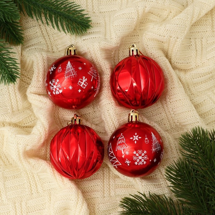 Набор шаров пластик d-5,5 см, 4 шт "Новогодние забавы" геометрия грани, красный
