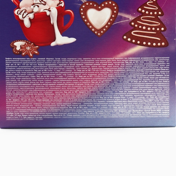 Состав: сахар, патока, глазурь кондитерская (сахар, заменитель масла какао нетемперируемый лауринового типа (рафинированное дезодорированное пальмоядровое масло, эмульгаторы: Е492, лецитин соевый), какао-порошок, крупа манная, соль, ароматизатор) заменитель молочного жира (рафинированные дезодорированные растительные масла в антуральном и модифицированном виде, антиокислитель - концентрат смеси токоферолов), кондитерский полуфабрикат (патока, сахар, заменитель молочного жира (рафинированные дезодорированные масла и жиры (пальмовое, подсолнечное, пальмоядровое), эмульгатор Е471), сыворотка молочная сухая, молоко сухое обезжиренное, загуститель Е1422, агент желирующий - каррагинан, консервант Е202), агент желирующий - агар, продукты яичные, краситель Е150а, соль, ароматизатор.