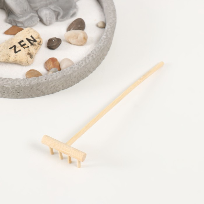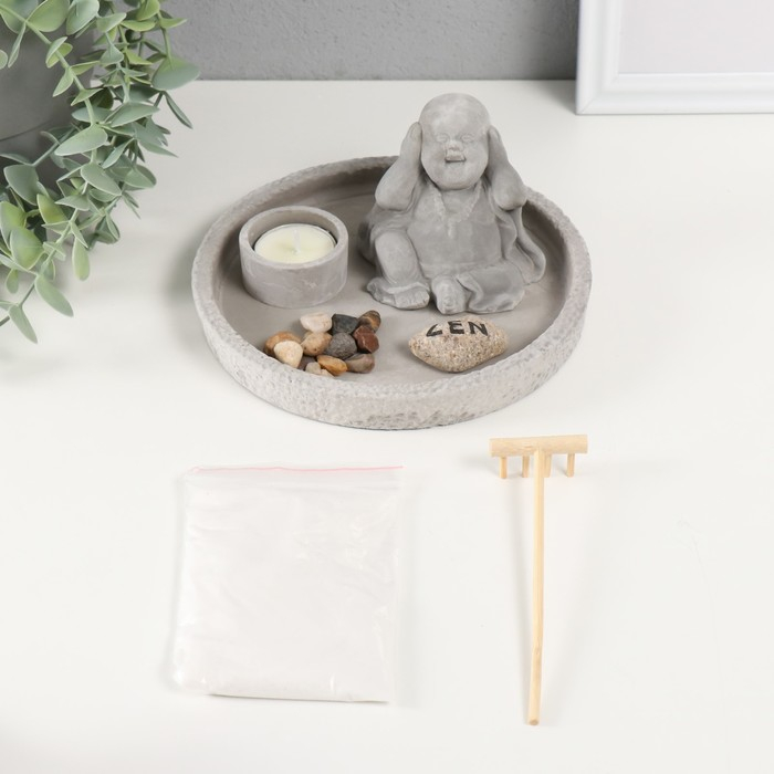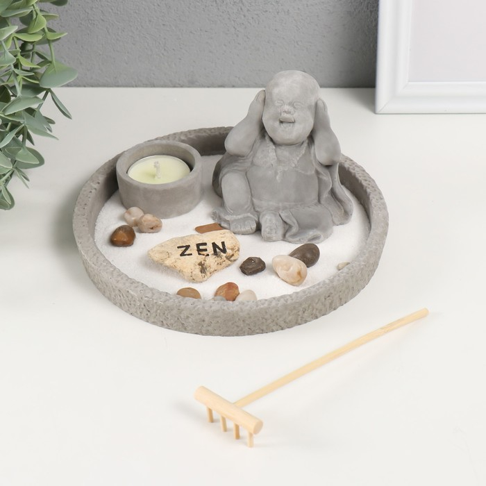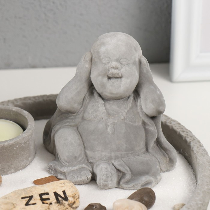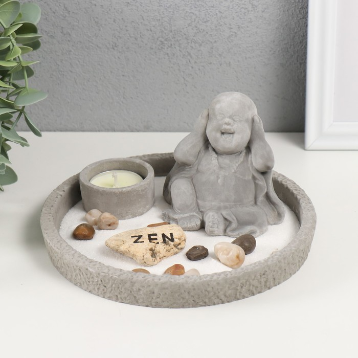 Сад камней Дзен d=16,5 см Хотей "ничего не слышу", со свечой, серый