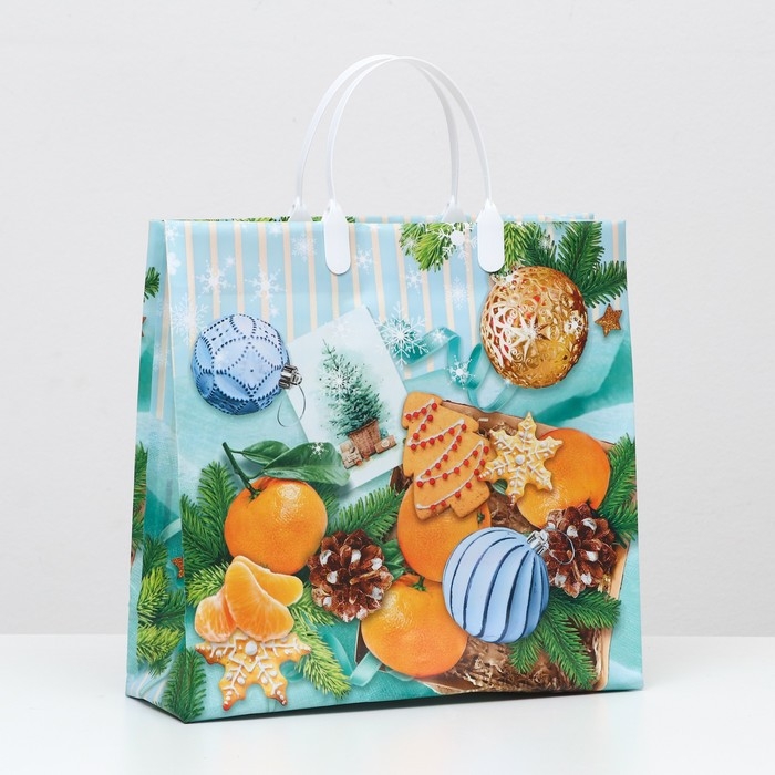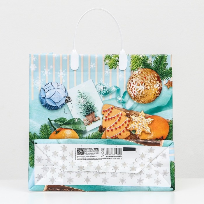 Новогодний подарочный пакет с ярким, красочным рисунком создаст праздничное настроение.