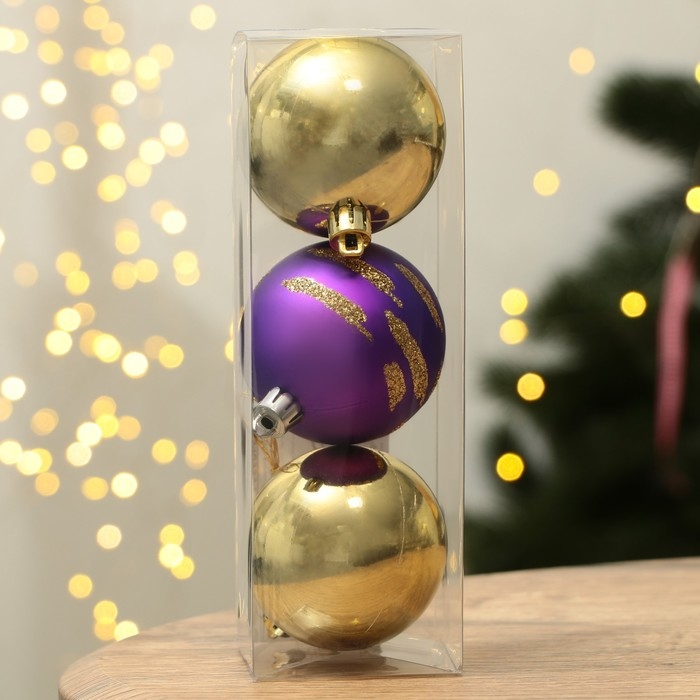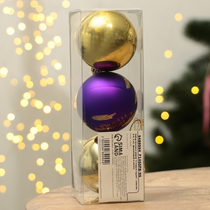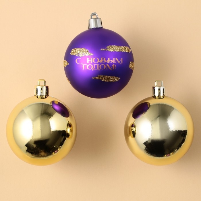 Шары ёлочные новогодние «С Новым годом!», на Новый год, пластик, d=6, 3 шт., цвет фиолетовый и золотой