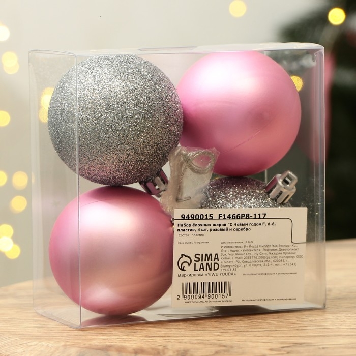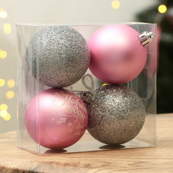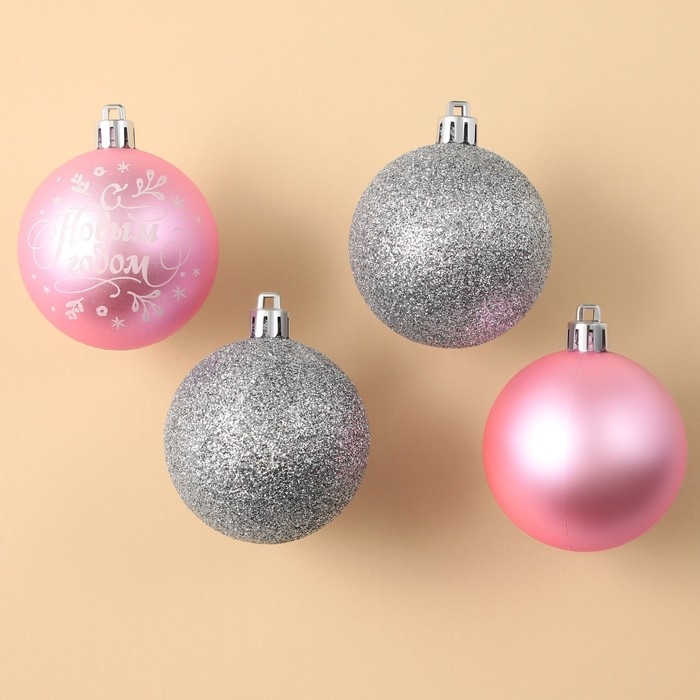 Шары ёлочные новогодние «С Новым годом!», на Новый год, пластик, d=6, 4 шт., цвет розовый и серебристый