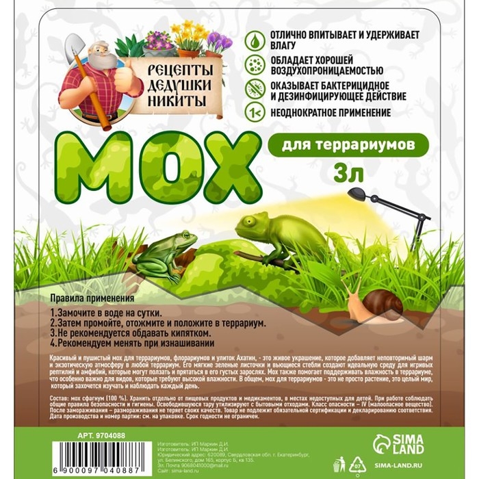 Мы гордимся качеством нашего мха и уверены, что он станет прекрасным дополнением к вашему домашнему террариуму. Создайте яркое и комфортное место для своих питомцев с мхом "Рецепты дедушки Никиты"!