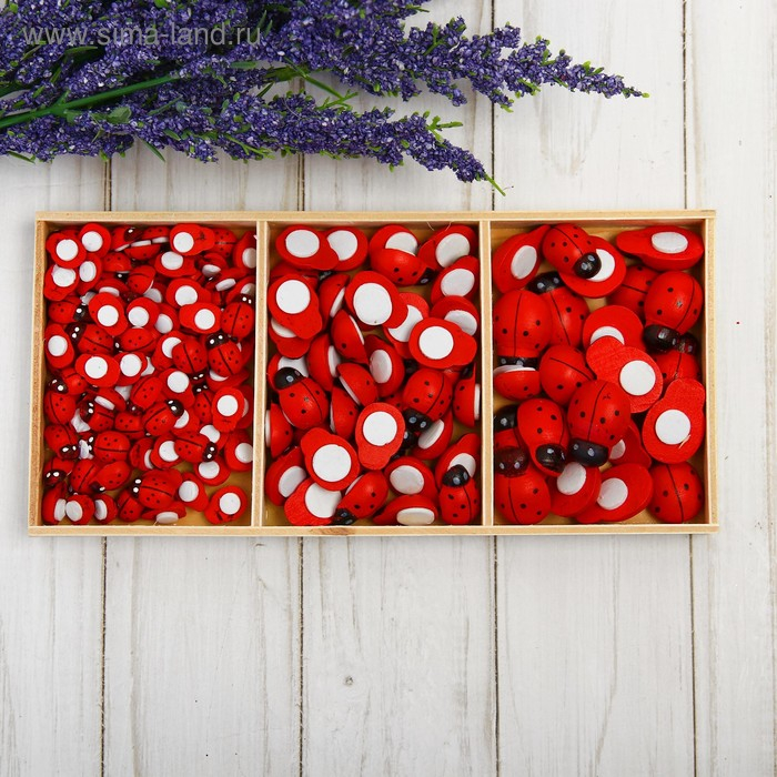 Тело божьих коровок сделано из дерева, а на основании находится круглая наклейка.