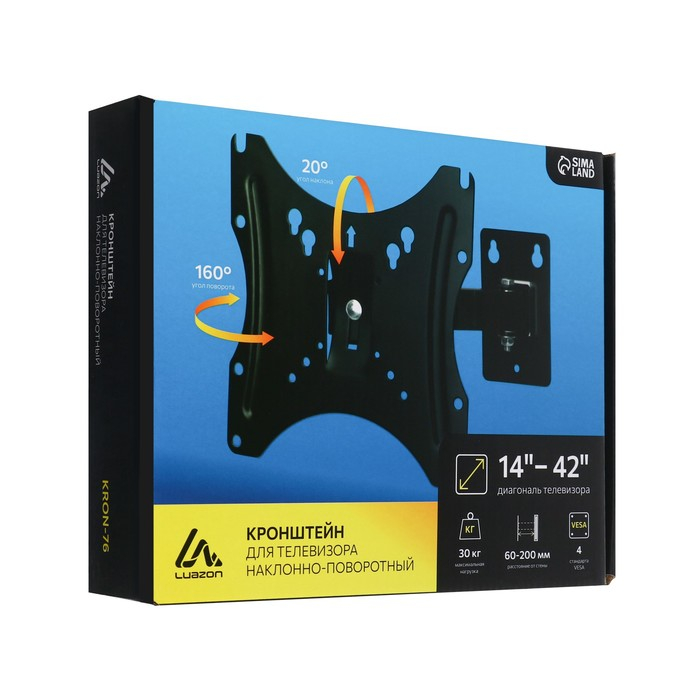 Кронштейн Luazon KrON-76, для ТВ, наклонно-поворотный, 14-42", 60-200 мм от стены, чёрный