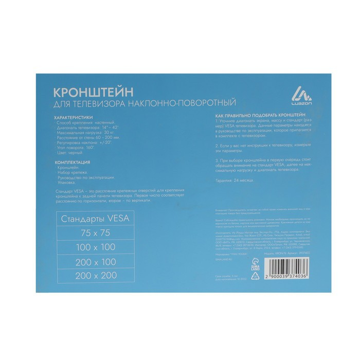 Кронштейн предназначен для крепления на стену большинства плоских телевизоров с диагональю от 14 до 42 дюймов. Выдерживает большую нагрузку, имеет прочный фиксирующий механизм, с помощью которого надёжно удерживает телевизор. Кроме того, в данной модели возможна регулировка наклона и поворота телевизора. Кронштейн позволяет закрепить телевизор в оптимальном положении как дома, так и в общественных местах.