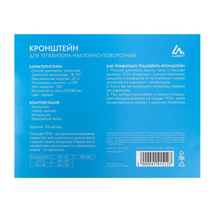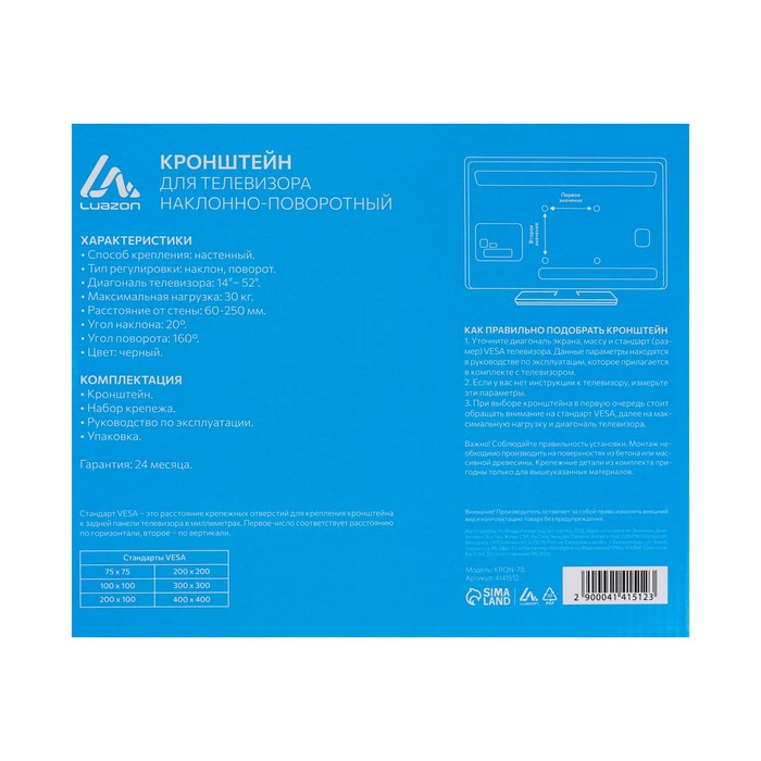 Кронштейн предназначен для крепления на стену большинства плоских телевизоров с диагональю от 14 до 52 дюймов. Выдерживает большую нагрузку, имеет прочный фиксирующий механизм, с помощью которого надёжно удерживает телевизор. Кроме того, в данной модели возможна регулировка наклона и поворота телевизора. Кронштейн позволяет закрепить телевизор в оптимальном положении как дома, так и в общественных местах.