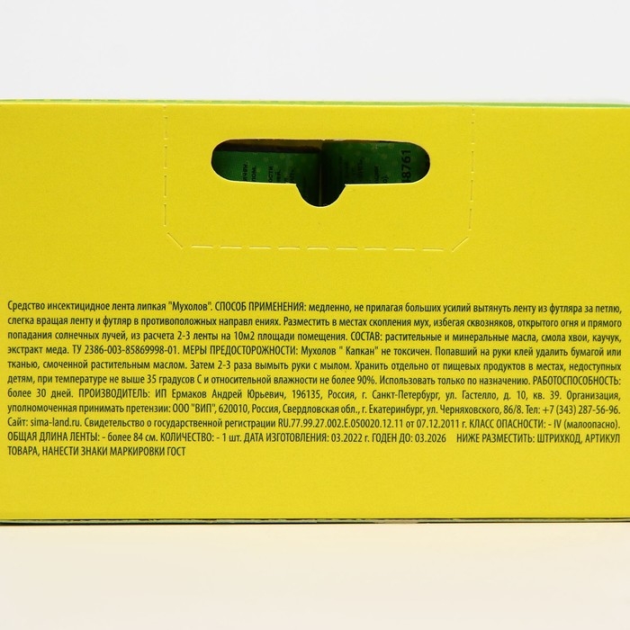 Липкая лента от мух SAFEX – это эффективное средство для борьбы с насекомыми в помещениях. Она представляет собой специальную ленту, покрытую клеевым составом, который привлекает и удерживает мух.Способ применения• необходимо аккуратно вытянуть ленту за петлю, которая находится на ее конце• ленту нужно закрепить в нужном месте с помощью кнопки или петлиКоличество лент, необходимых для достижения максимального эффекта, зависит от численности мух в помещении. Однако следует помнить, что не более одной ленты следует использовать на комнату площадью 10 квадратных метров.Для достижения наилучшего результата рекомендуется располагать ленты в тех местах, где чаще всего появляются мухи. Это могут быть окна, двери, углы комнат и другие места, которые привлекают насекомых.Перед использованием липкой ленты от мух SAFEX следует ознакомиться с мерами предосторожности.• В первую очередь необходимо хранить ленту в закрытых, сухих помещениях, в местах, недоступных для детей и животных.• Также следует хранить ленту отдельно от пищевых продуктов при комнатной температуре.• При использовании ленты следует избегать ее размещения на прямом солнечном свете и в сквозняке. Необходимо использовать ленту только по назначению.Состав: полиизобутилен (15-50%), нафтеновые масла (20-40%), 1,3-бутадиен / стирольные сополимеры (5-12%), полиэтилен (5-10%) и пентаэритриттетракис (3-(3,5-ди-трет-бутил-4-гидроксифенил) пропионат) (0,2%).Данный состав обеспечивает высокую эффективность ленты и гарантирует быстрое уничтожение мух в помещении.