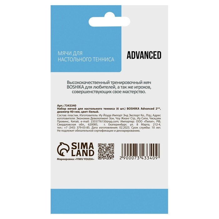 Набор мячей для настольного тенниса BOSHIKA Advanced 2*, d=40+ мм, 6 шт., цвет белый