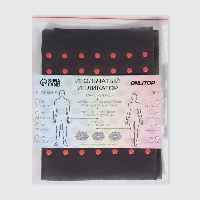 Ипликатор-коврик представляет собой основание, на котором закреплены модули с иглами из качественного пластика. Изделие предназначено для выполнения точечного массажа с целью повысить общий тонус организма через воздействие на различные части тела.