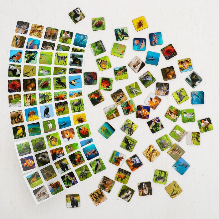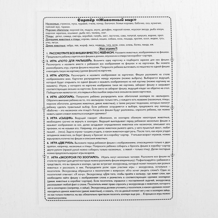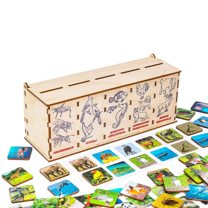 В комплекте: 60 фишек с изображением различных предметов, 6 карточек, коробка-сортер, инструкция.