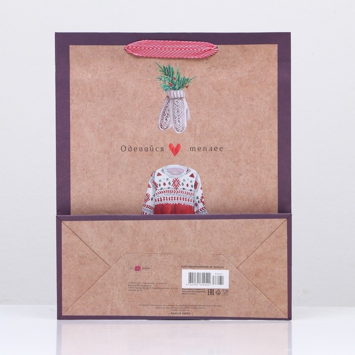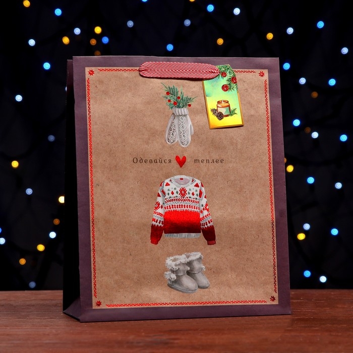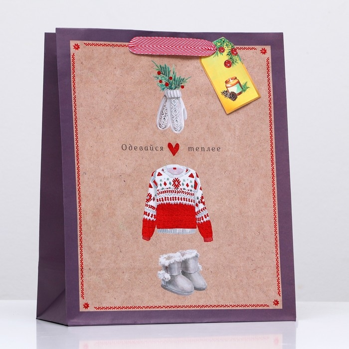 Новый год. Пакет бумажный подарочный новогодний крафт "Одевайтесь теплее" 26 х 32 х 12 см.