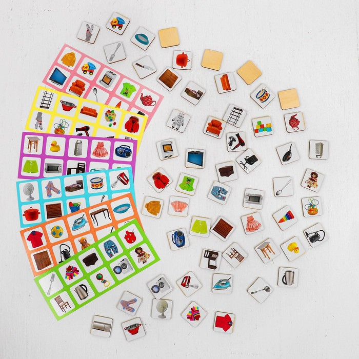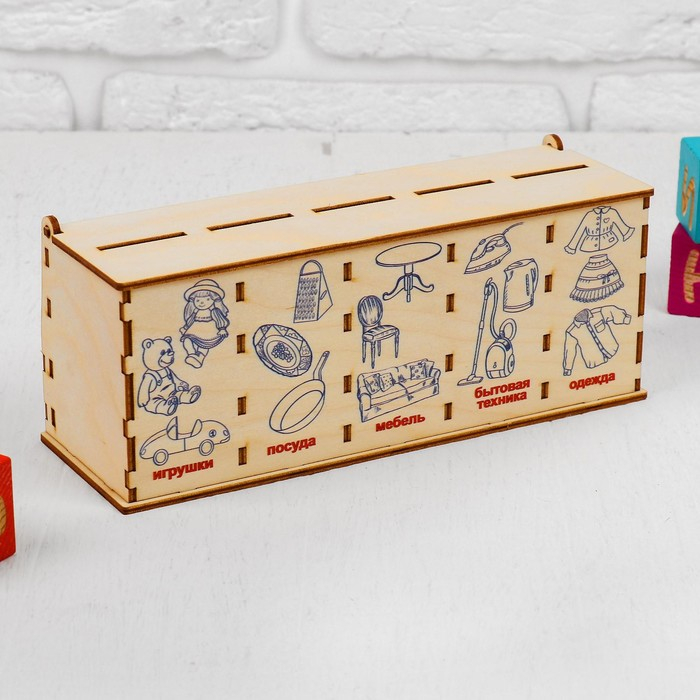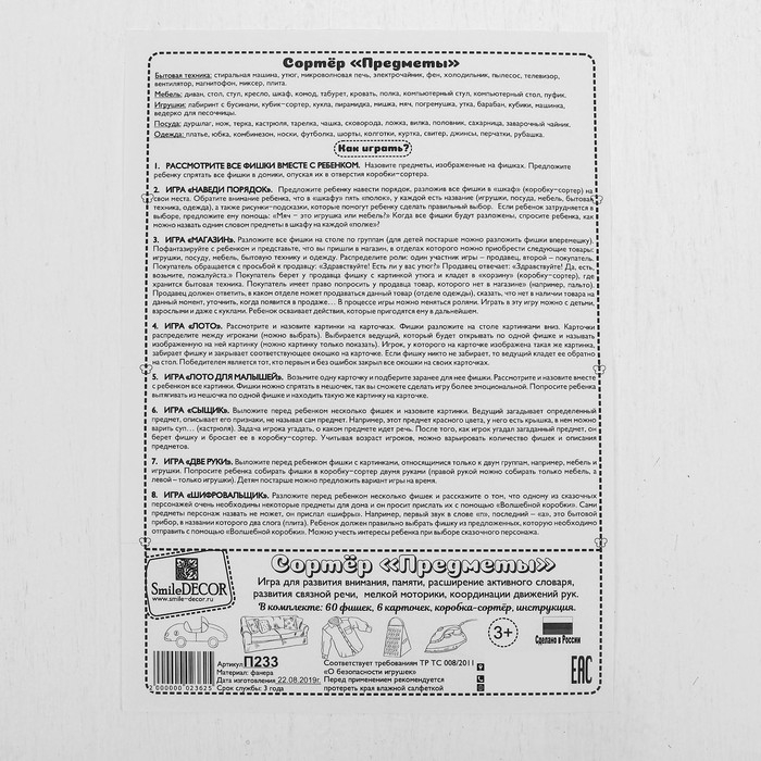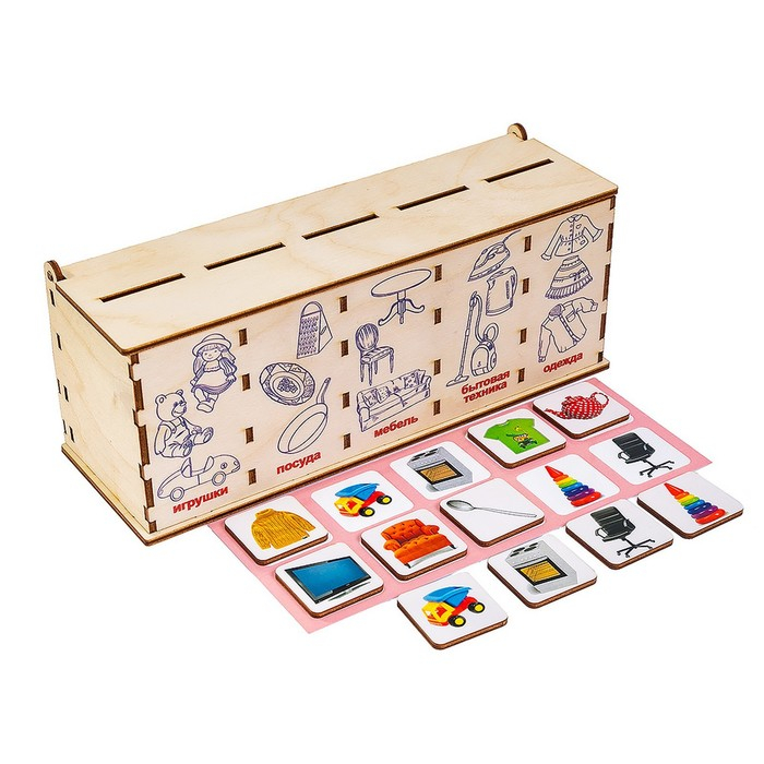 В комплекте: 60 фишек с изображением различных предметов, 6 карточек, коробка-сортер, инструкция.