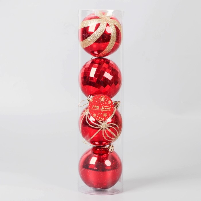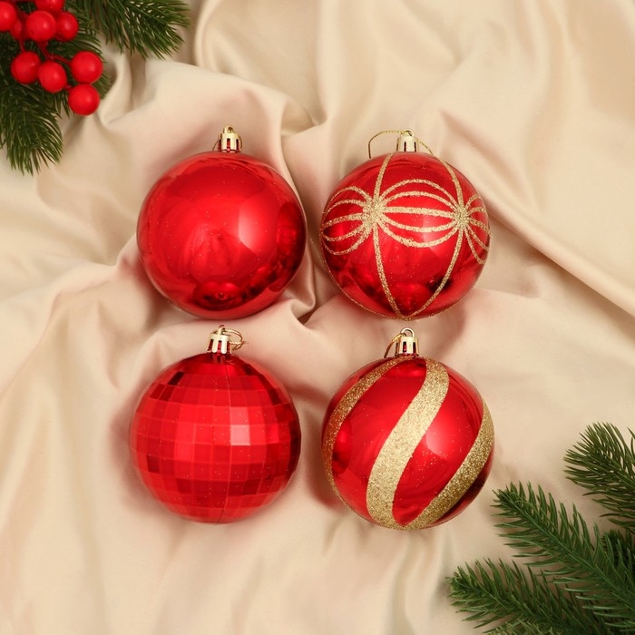 Набор шаров пластик d-8 см, 4 шт "Агнет" полосы узор, красно-золотой
