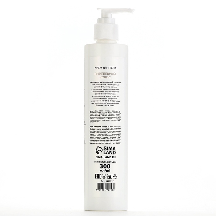 AQUA, COCOS NUCIFERA (COCONUT) OIL, PARAFFINUM LIQVIDUM, GLYCERIN, PERSEA GRATISSIMA OIL, STEARIC ACID, CETEARETH-20, CETEARYL ALCOHOL, HYDROXYETHYLUREA, CARBOMER, PANTHENOL, CAPRYLIC/ CAPRIC TRIGLYCERIDES, AROMA, COCOS NUCIFERA (COCONUT) EXTRACT, TOCOPHEROL, BENZYL ALCOHOL, ETHYLHEXYLGLYCERIN, TOCOPHEROL, TRIETHANOLAMINE, TETRASODIUM EDTA.