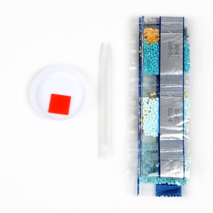 Разложите кристаллики с помощью карандаша по указанной схеме, заполнив полотно. На картине уже обозначены необходимые оттенки. Холст с клеевым покрытием будет надёжно удерживать стразы.