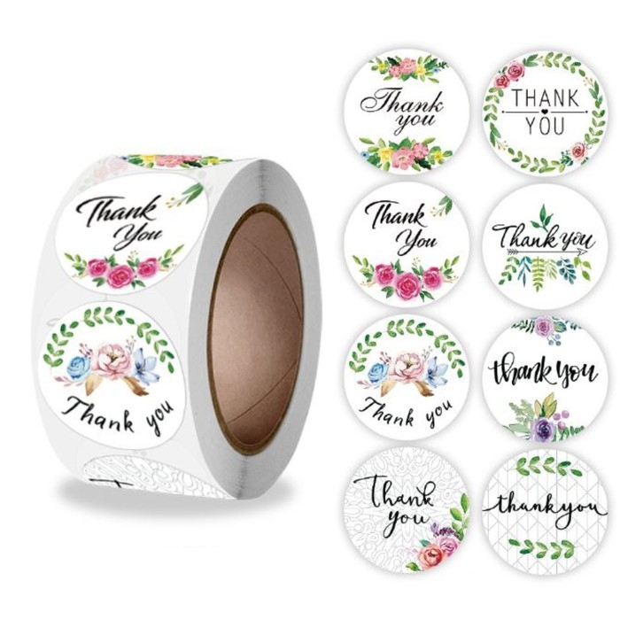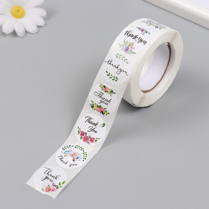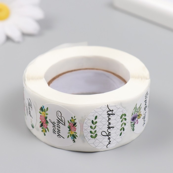 Наклейка бумага "Спасибо. Цветы" d=2,5 см 500 шт в рулоне 3х6,5х6,5 см