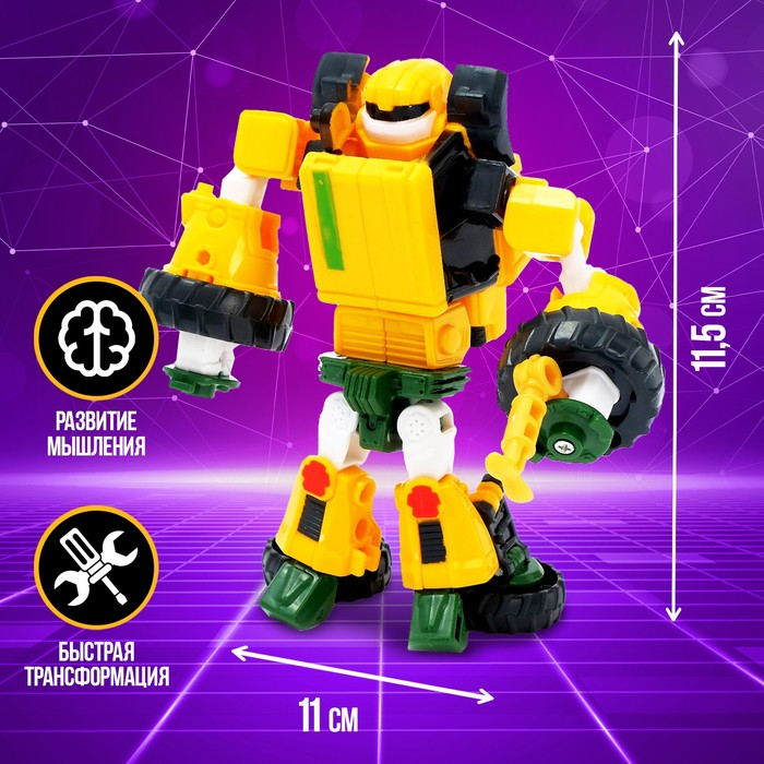 - Размер в виде трактора: 9,5 × 6 × 6,5 см. В виде робота: 11 × 4 × 11,5 см.