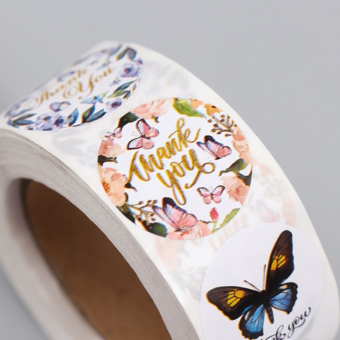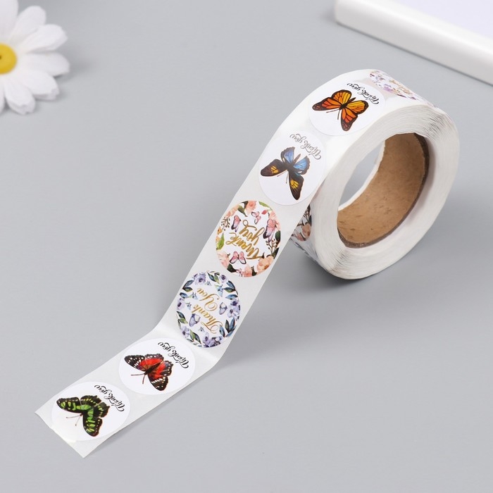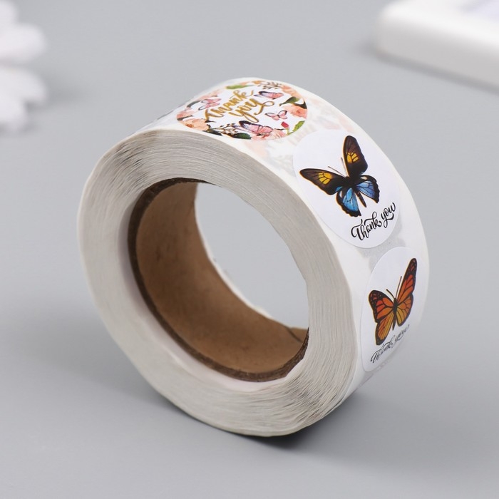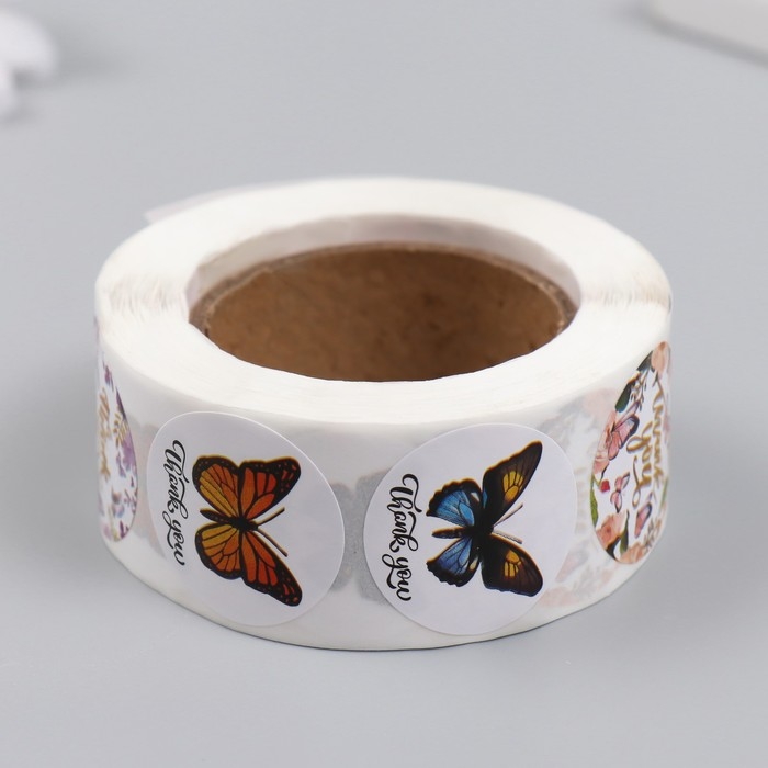Наклейка бумага "Бабочки. Спасибо" d=2,5 см 500 шт в рулоне