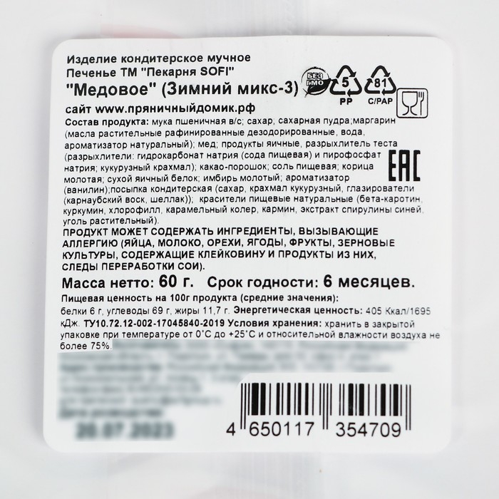Новый год. Печенье медовое "Зимние фигурки", МИКС, 60 г
