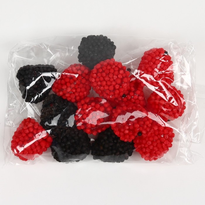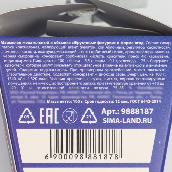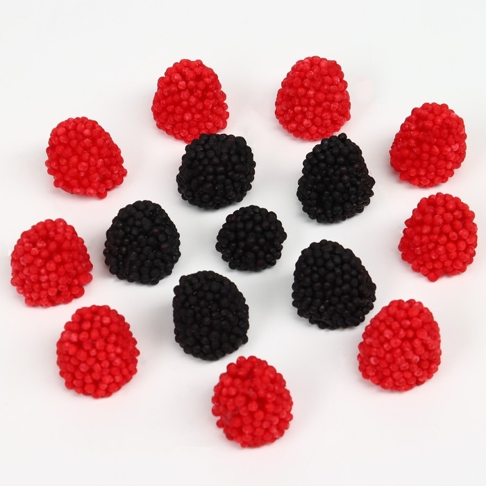 Состав: сахар, патока крахмальная, желирующий агент: желатин, сок яблочный, регулятор кислотности: лимонная кислота, влагоудерживающий агент:сорбитовый сироп, ароматизаторы: малина, чёрная смородина, консервант: сорбиновая кислота, красиели: понсо 4R, кармуазина, индигокармин.