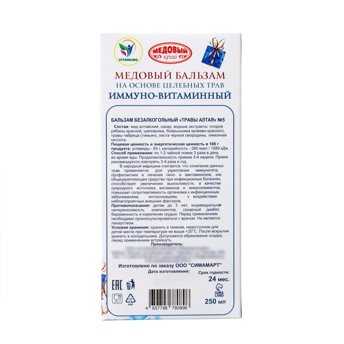 Новый год. Новогодний медовый бальзам алтайский "Иммуно-витаминный", 250 мл