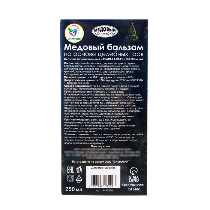Новогодний медовый бальзам Vitamuno алтайский "Женский", 250 мл