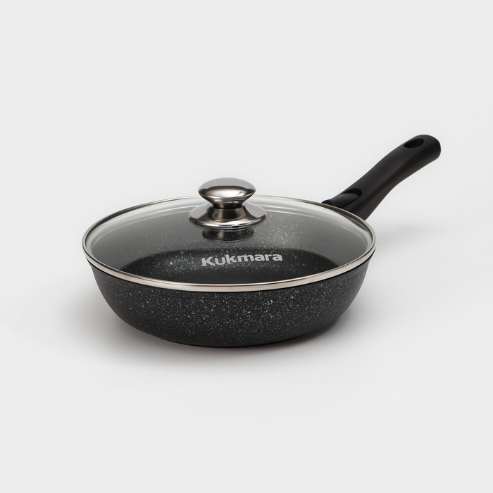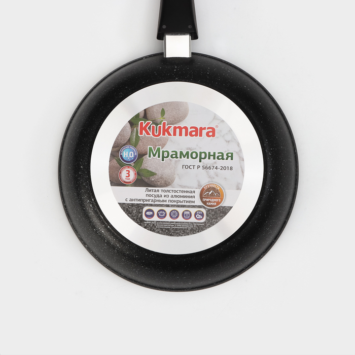 Посуда Kukmara «Мраморная» изготовлена из литого алюминия и покрыта инновационным антипригарным мраморным покрытием на водной основе, усиленным сверхтвёрдыми частицами минералов.