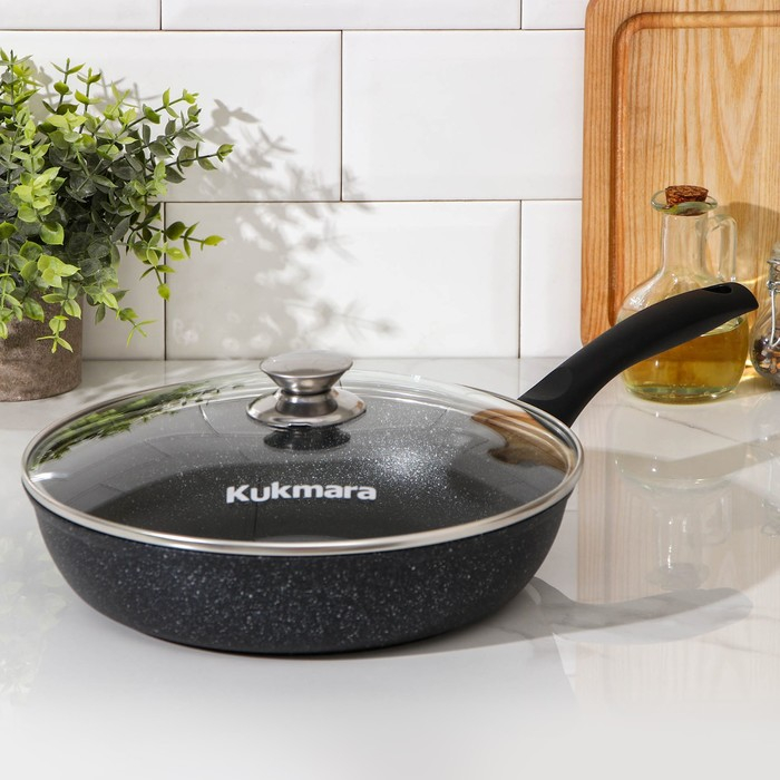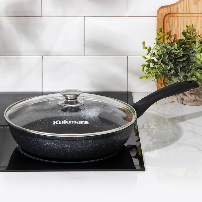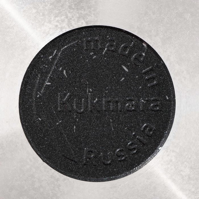 Посуда Kukmara «Мраморная» изготовлена из литого алюминия и покрыта инновационным антипригарным мраморным покрытием на водной основе, усиленным сверхтвёрдыми частицами минералов.