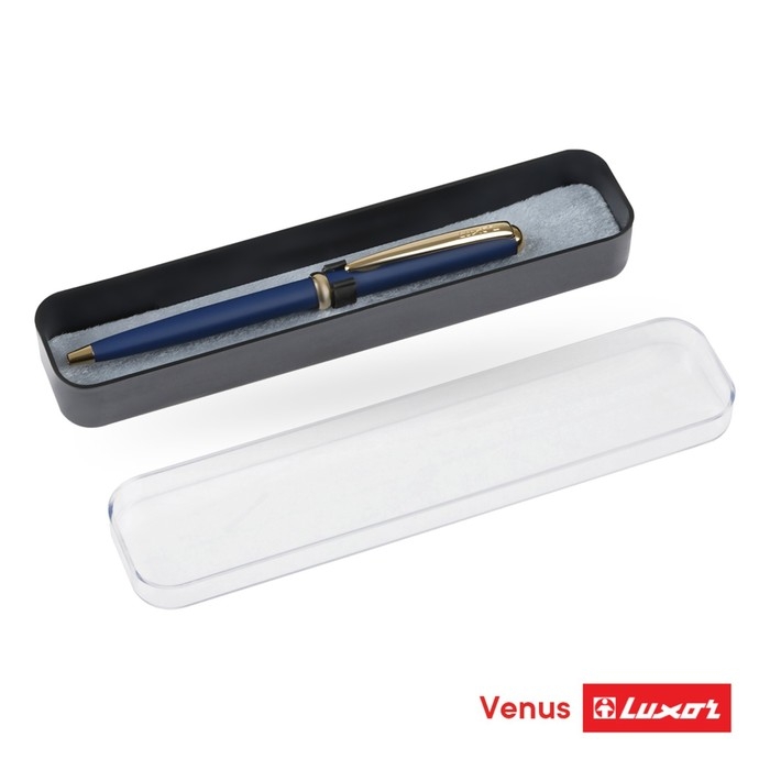 Шариковая ручка Luxor Venus – стильный инструмент для письма и отличный подарок. Пишущий узел диаметром 0,7 мм оставляет линию толщиной 0,5 мм и подходит для любого стиля письма. Длина линии письма может достигать 600 метров. Чернила ультрапониженной вязкости обеспечивают комфортное, плавное письмо и устойчивость к выцветанию на солнце. Диаметр ручки – 8,59 мм. Матовое покрытие корпуса из латуни насыщенного синего цвета в сочетании с золотыми деталями выгодно подчеркивают элегантность ручки. Клип из нержавеющей стали позволяет закрепить ручку на блокнотах, ежедневниках или карманах одежды. Изделие упаковано в пластиковый футляр. Подарочная ручка и футляр подходят для персонализации. Шариковая ручка Luxor Venus - отличный подарок на любой праздник!