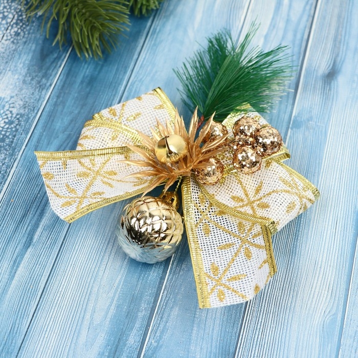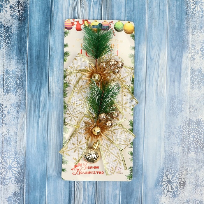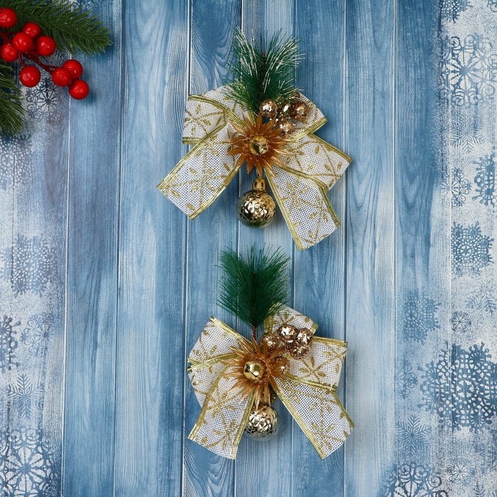 Украшение ёлочное "Еловая композиция" (набор 2 шт) бант с принтом, 11х13 см, бело-золотой