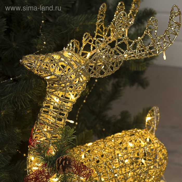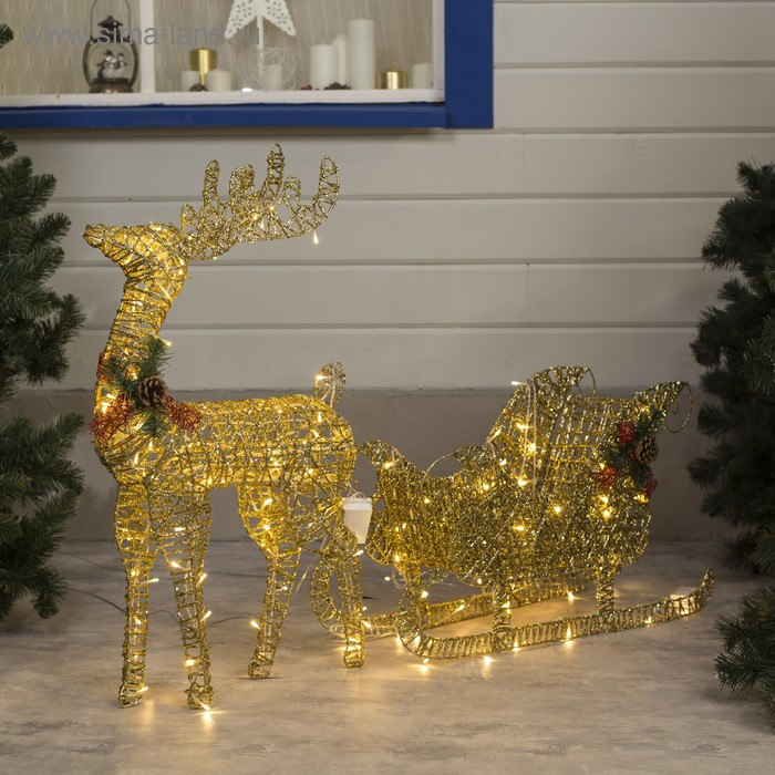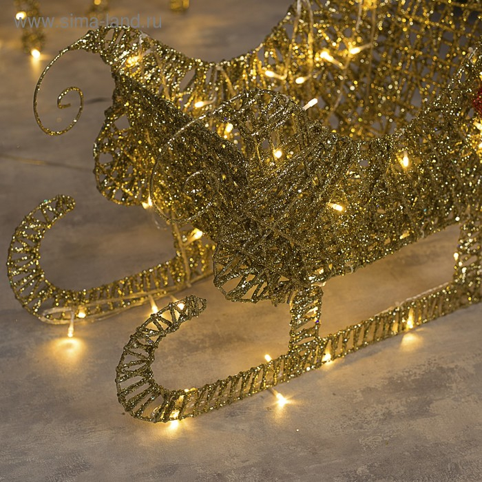 Светодиодная фигура «Олень с санями золотистый», олень: 50 × 85 × 18 см, сани: 70 × 43 × 22 см, металл, 220 В, свечение тёплое белое