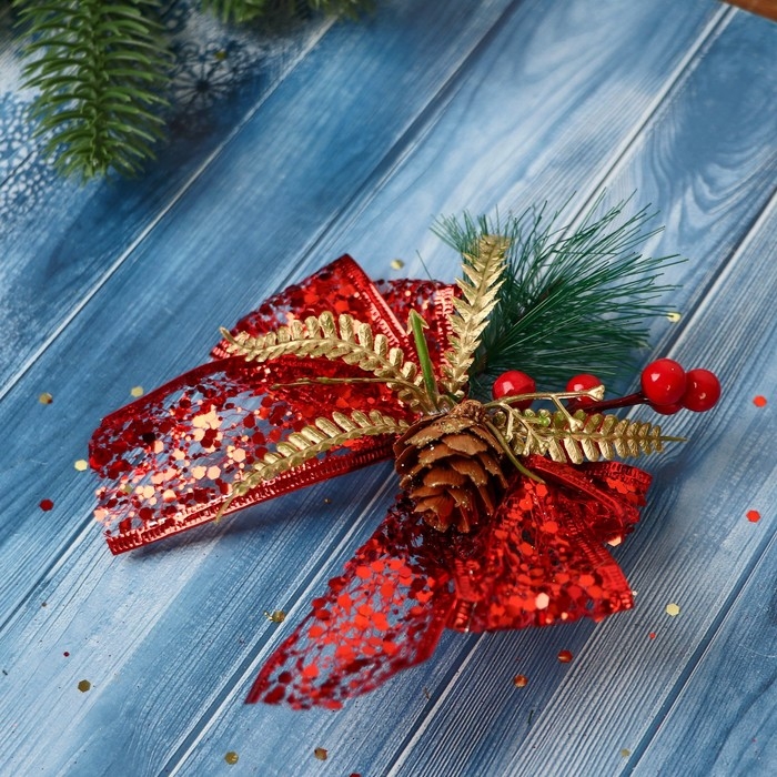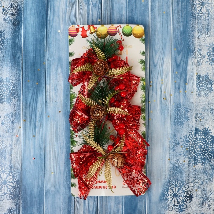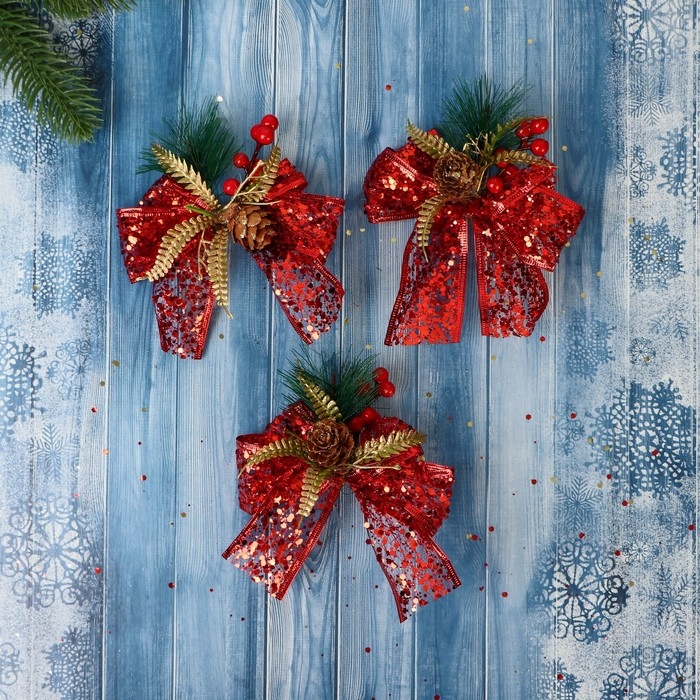Украшение ёлочное "Еловая композиция" (набор 3 шт) бант блеск шишка, 11х9 см, красный