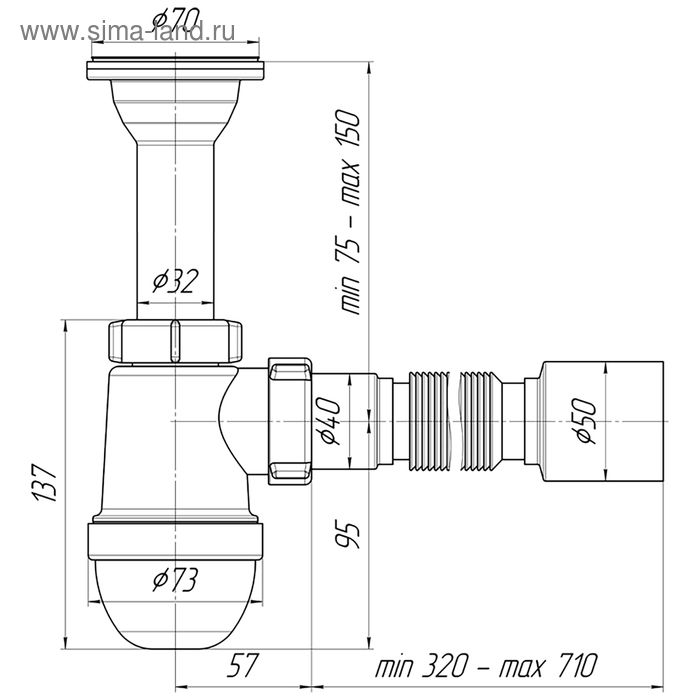 Сифон бутылочного типа предназначен для кухонной мойки с диаметром сливного отверстия 50 мм.